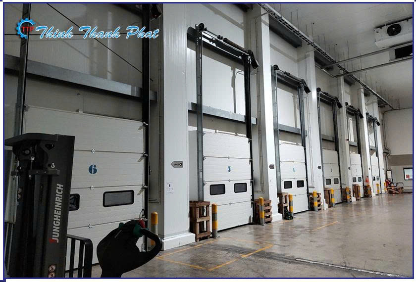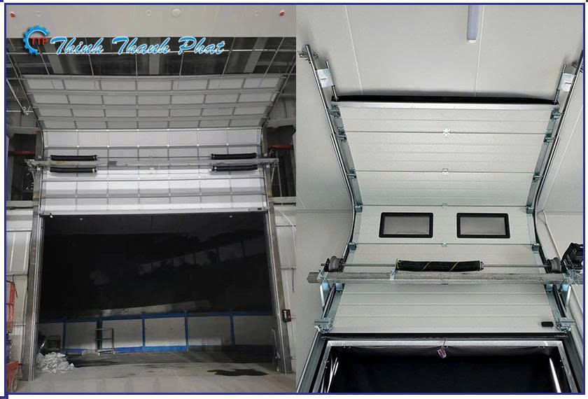 Khi cửa mở, thân cửa sẽ trượt lên trần nhà dọc theo hệ thống ray dẫn hướng thay vì cuộn thành lô cuốn, giúp tiết kiệm tối đa diện tích chiều cao trần và không gian lắp đặt, đặc biệt phù hợp với các garage ô tô, nhà xưởng, kho lạnh có chiều cao trần hạn chế hoặc cần không gian thông thoáng phía trên cửa.