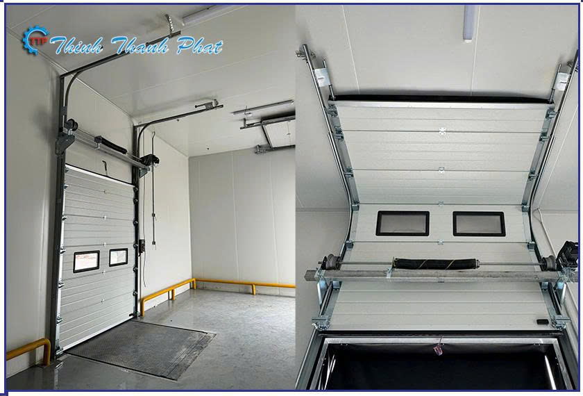 - Trượt lên trần: Cửa mở theo phương thẳng đứng và các tấm panel sẽ trượt dọc theo ray dẫn hướng, nằm song song hoặc vuông góc (tùy thiết kế ray: vuông góc, xiên hoặc đứng) với trần nhà khi cửa mở hoàn toàn.