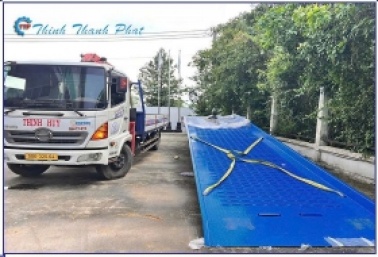 - Cầu xe nâng (Container Ramp/Dock Ramp): Là thiết bị cơ khí tạo độ dốc để xe nâng có thể di chuyển an toàn và dễ dàng từ mặt đất lên sàn container (hoặc ngược lại) để thực hiện công tác bốc dỡ, xếp dỡ hàng hóa.